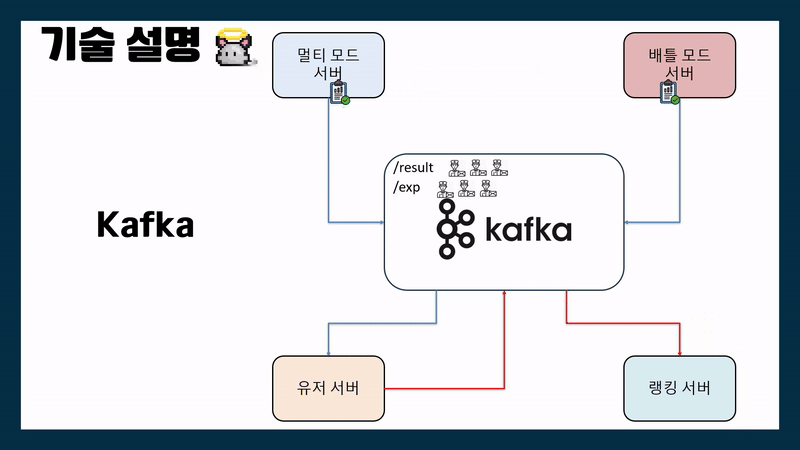 - Kafka를 사용하여 게임 결과를 유저 서버에 비동기적으로 전송하여 게임 서비스는 Kafka /result 토픽에 결과를 게시하고 즉시 다음 작업으로 넘어갈 수 있음. (게임 서비스와 유저 서비스 간의 병목을 줄임)